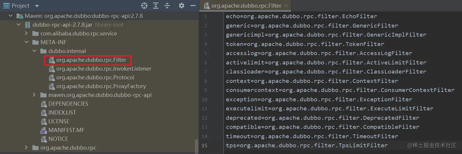 Dubbo 中大量采用了 SPI 机制,这里配置 Filter 也是这种方式。