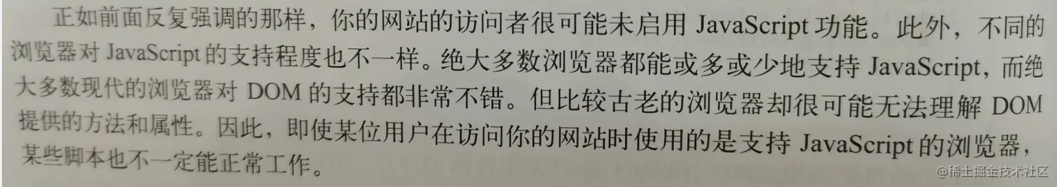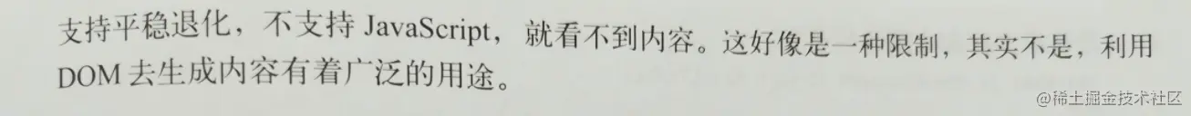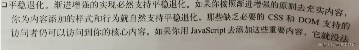 Javascript 未生效的情况也是需要考虑的,网站的访问者可能禁用 js,或者其他情况下 js 未能按照预期工作。这时候如果我们正确使用了 js 脚本,就可以让访问者在他们的浏览器不支持 js 的情况下仍能顺利浏览网站。所谓的平稳退化(graceful degradation)就是虽然某些功能无法使用,但最基本的操作仍能顺利完成。但是实现方式有优劣。
