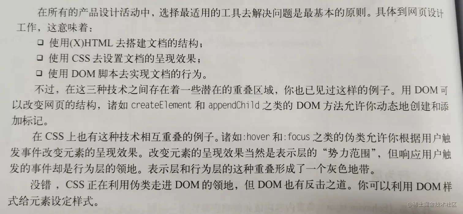 没错,你可以说还能再加一层,也就是浏览器的 JavaScript API,包括 cookie 和 window 等。 但随着HTML5 的到来,上面所说的结构层、样式层和行为层(以及浏览器中的JavaScript API)已经被整装到一个小集合中:新的标记元素、更多媒体元素;新元素的交互方式、高级选择器、渐变、动画;Socket、Storage、多线程。