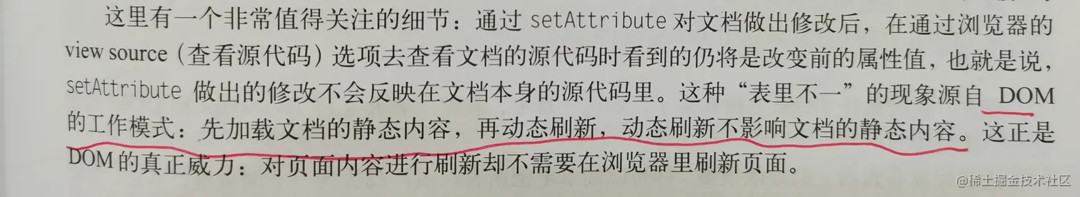setAttribute 方法是 “第 1 级 DOM”(DOM Level 1)的组成部分,它可以设置任意元素节点的任意属性。在 “第 1 级 DOM” 出现之前,可以通过另一种办法设置大部分元素的属性,例如,想要改变某个 input 元素的的 value 属性,可以这样: