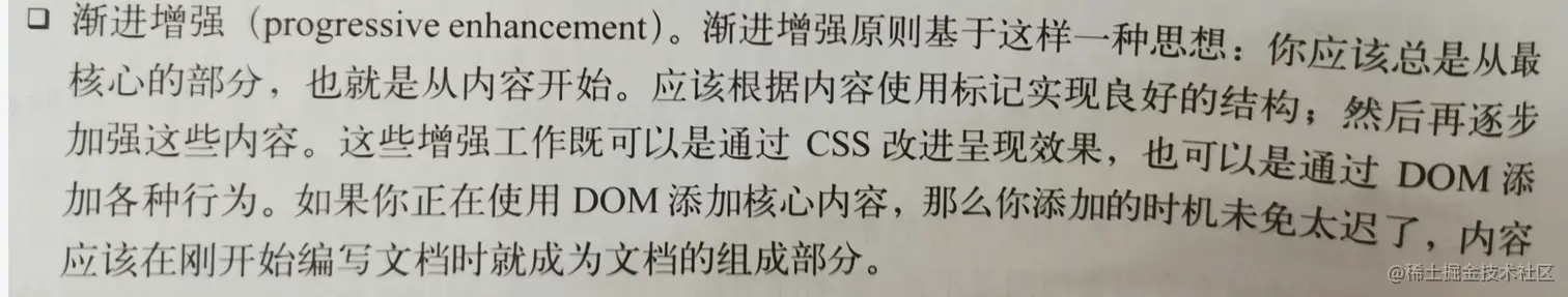 考虑平稳退化的例子,在 HTML 文档里使用诸如 onclick 之类的属性是一种既没有效率,也容易引发问题的做法。考虑把事件处理函数从元素节点中分离,网页就会健壮得多。