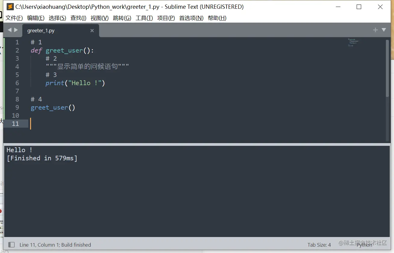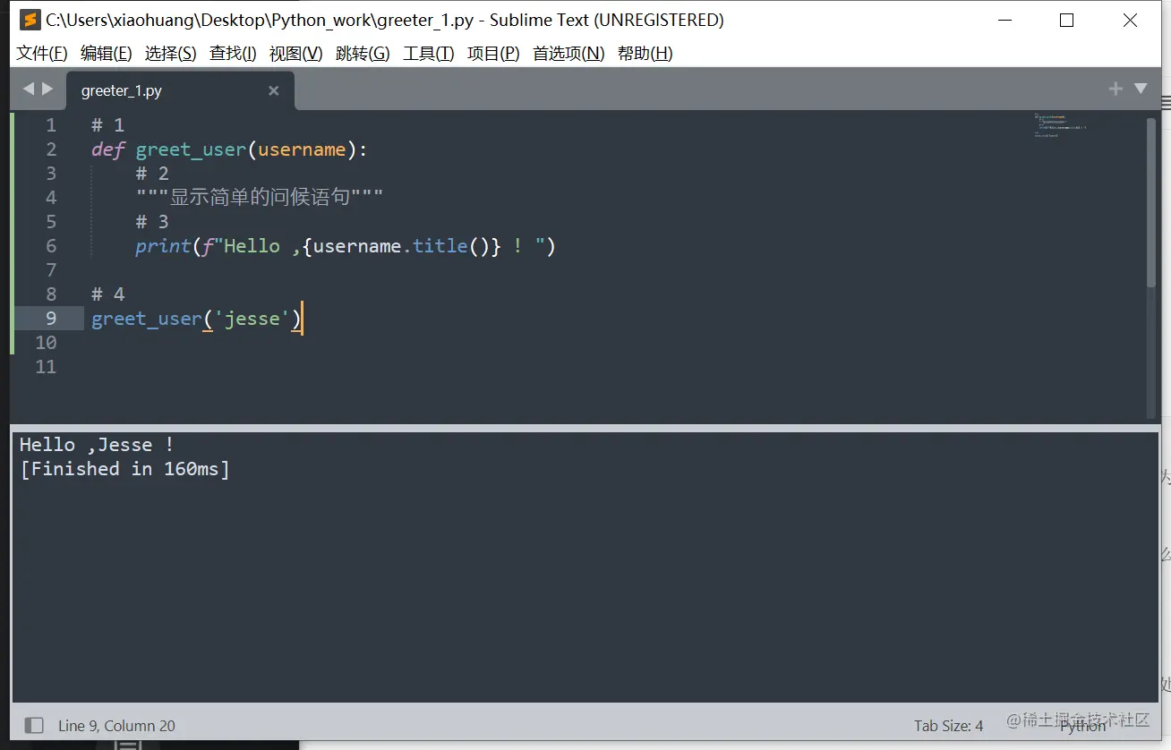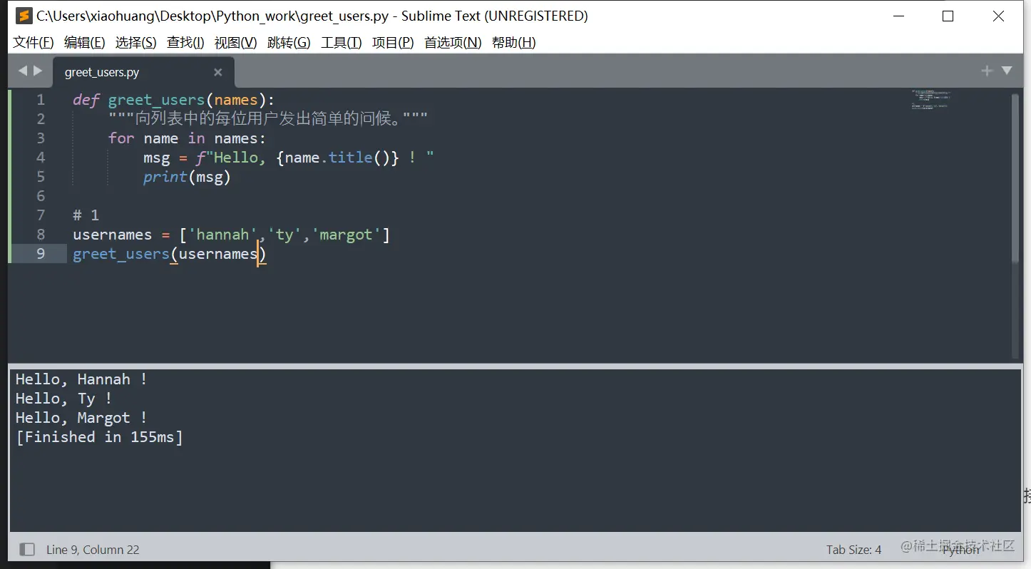 ❶处的代码行使用关键字def来告诉Python,你要定义一个函数。这是函数定义,向Python指出了函数名,还可能在圆括号内指出函数为完成任务需要什么样的信息。在这里,函数名为greet_user(),它不需要任何信息就能完成工作,因此括号是空的(即便如此,括号也必不可少)。最后,定义以冒号结尾。