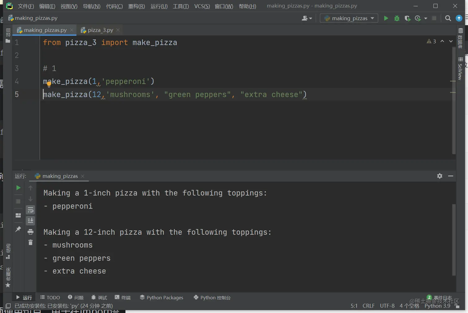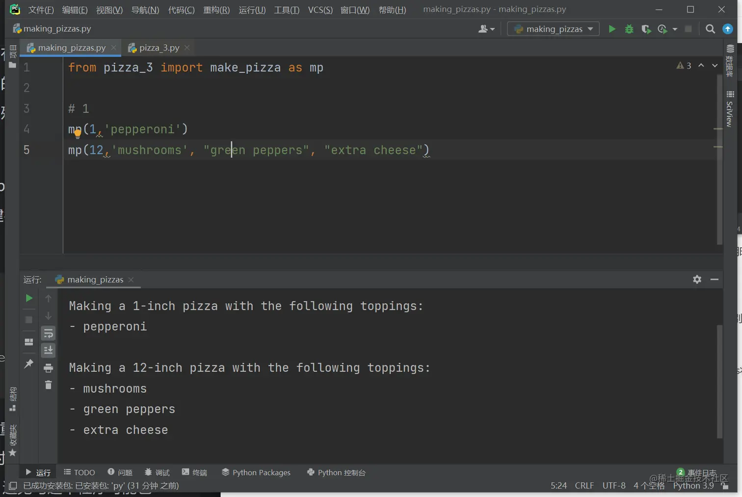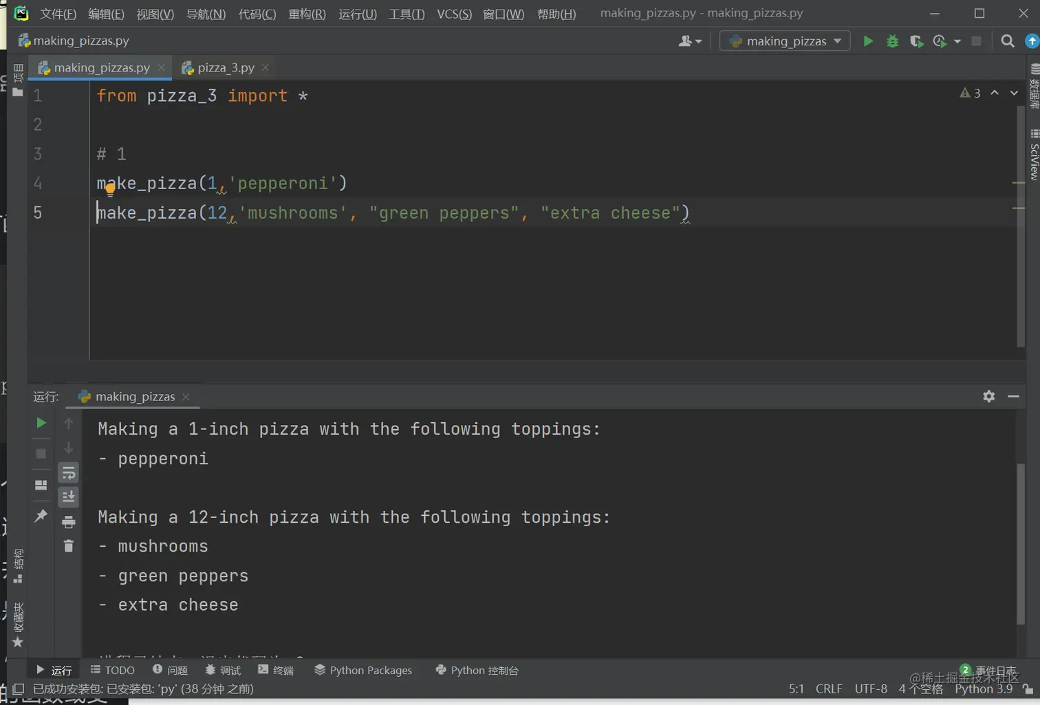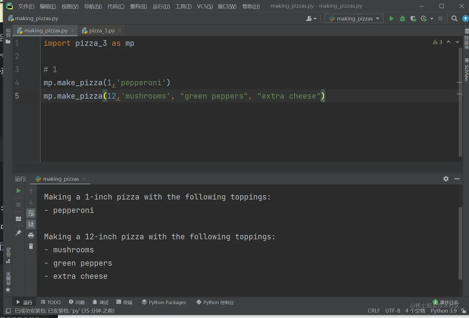 - 接下来,在pizza.py所在的目录中创建一个名为making_pizzas.py的文件。这个文件导入刚创建的模块,再调用make_pizza()两次: