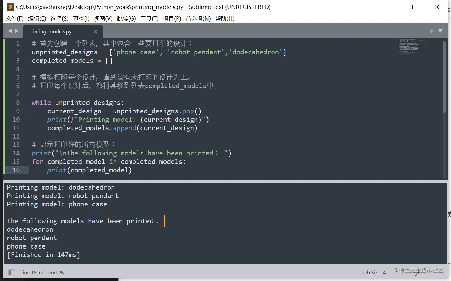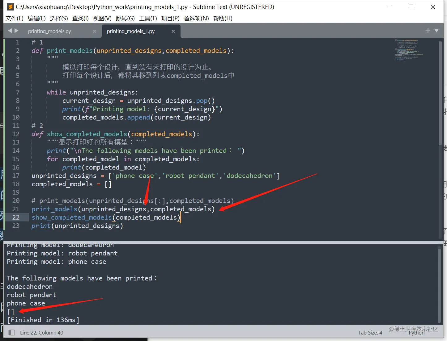 - 切片表示法[:]创建列表的副本。在printing_models.py中,如果不想清空未打印的设计列表,可像下面这样调用print_models():