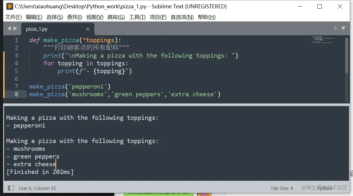 - 形参名*toppings中的星号让Python创建一个名为toppings的空元组,并将收到的所有值都封装到这个元组中。函数体内的函数调用print()通过生成输出,证明Python能够处理使用一个值来调用函数的情形,也能处理使用三个值来调用函数的情形。它以类似的方式处理不同的调用。注意,Python将实参封装到一个元组中,即便函数只收到一个值: