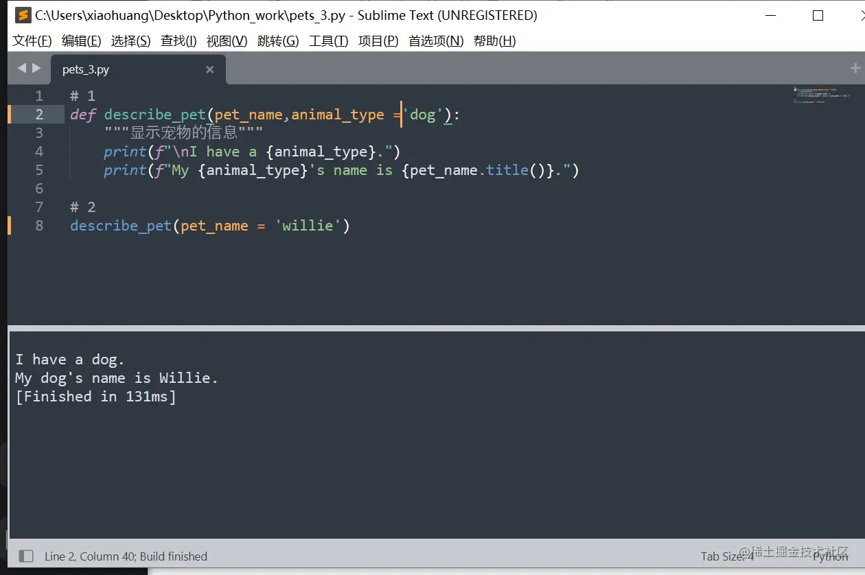 这里修改了函数describe_pet()的定义,在其中给形参animal_type指定了默认值'dog'。这样,调用这个函数时,如果没有给animal_type指定值,Python就将把这个形参设置为'dog':