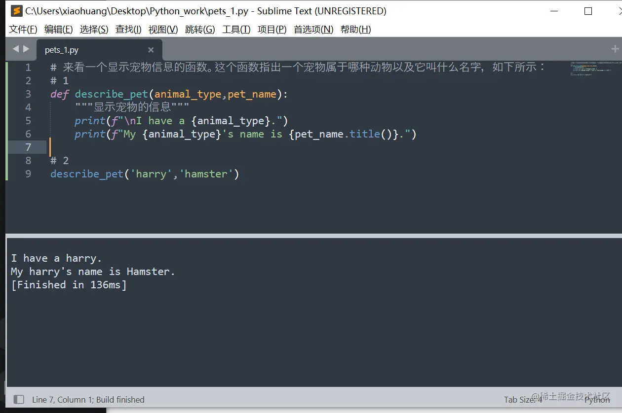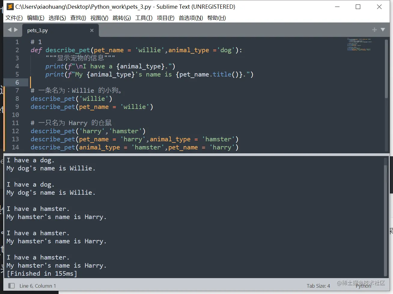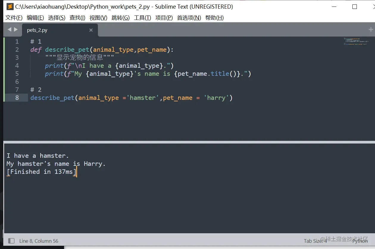 - 关键字实参是传递给函数的名称值对。因为直接在实参中将名称和值关联起来,所以向函数传递实参时不会混淆(不会得到名为Hamster的harry这样的结果)。