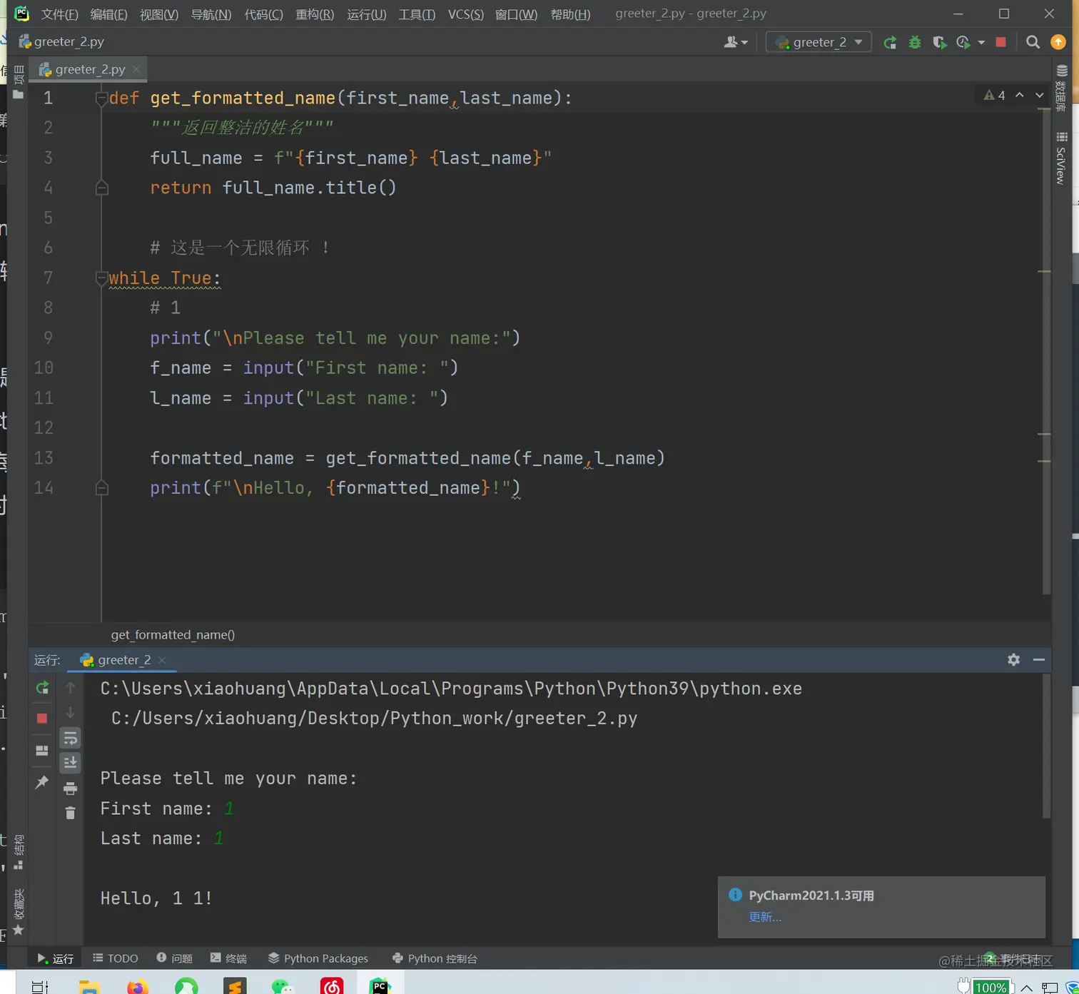 在本例中,使用的是get_formatted_name()的简单版本,不涉及中间名。while循环让用户输入姓名:依次提示用户输入名和姓(见❶)。