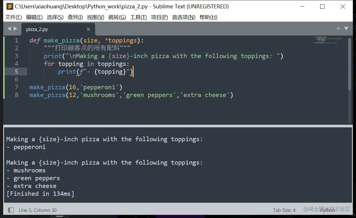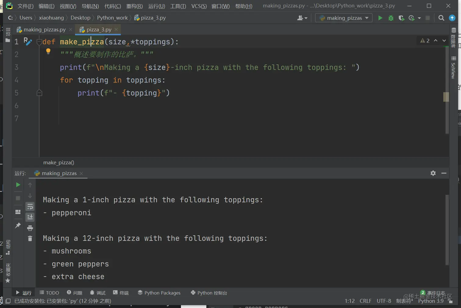 - 基于上述函数定义,Python将收到的第一个值赋给形参size,并将其他所有值都存储在元组toppings中。在函数调用中,首先指定表示比萨尺寸的实参,再根据需要指定任意数量的配料。现在,每个比萨都有了尺寸和一系列配料,而且这些信息按正确的顺序打印出来了——首先是尺寸,然后是配料: