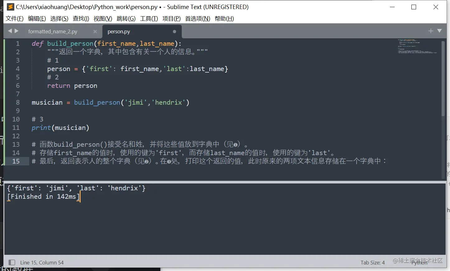 - 在build_profile()的函数体内,将名和姓加入了字典user_info中(见❶),因为总是会从用户那里收到这两项信息,而这两项信息没有放到这个字典中。接下来,将字典user_info返回到函数调用行。