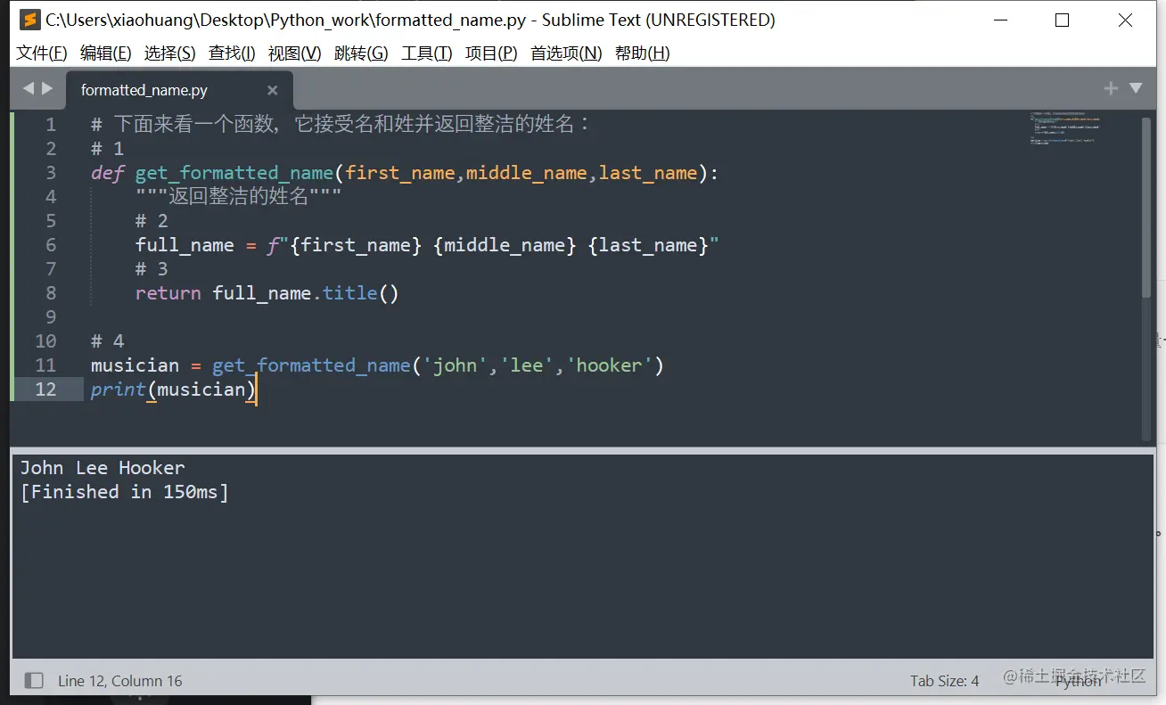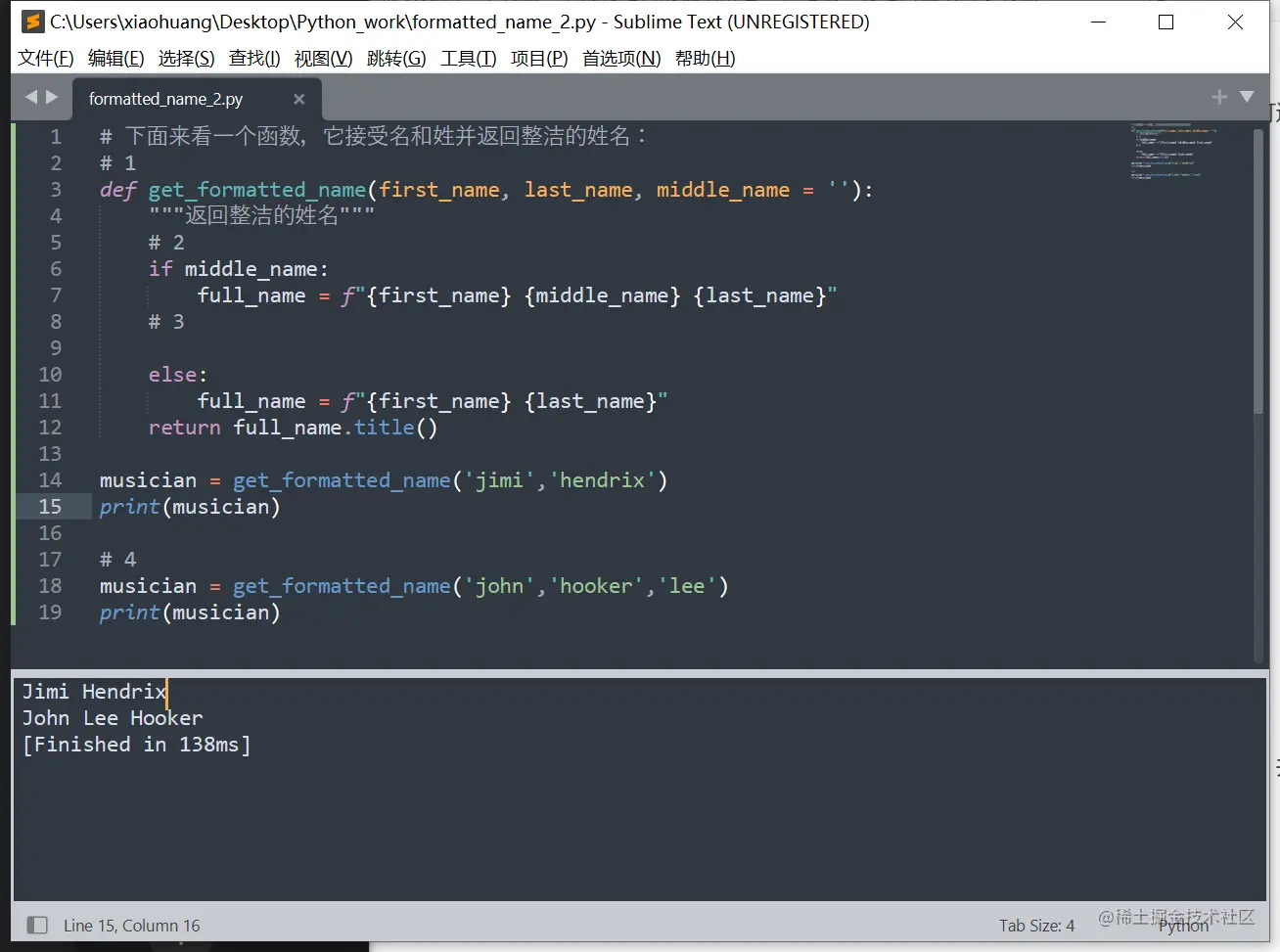 - 只要同时提供名、中间名和姓,这个函数就能正确运行。它根据这三部分创建一个字符串,在适当的地方加上空格,并将结果转换为首字母大写格式: