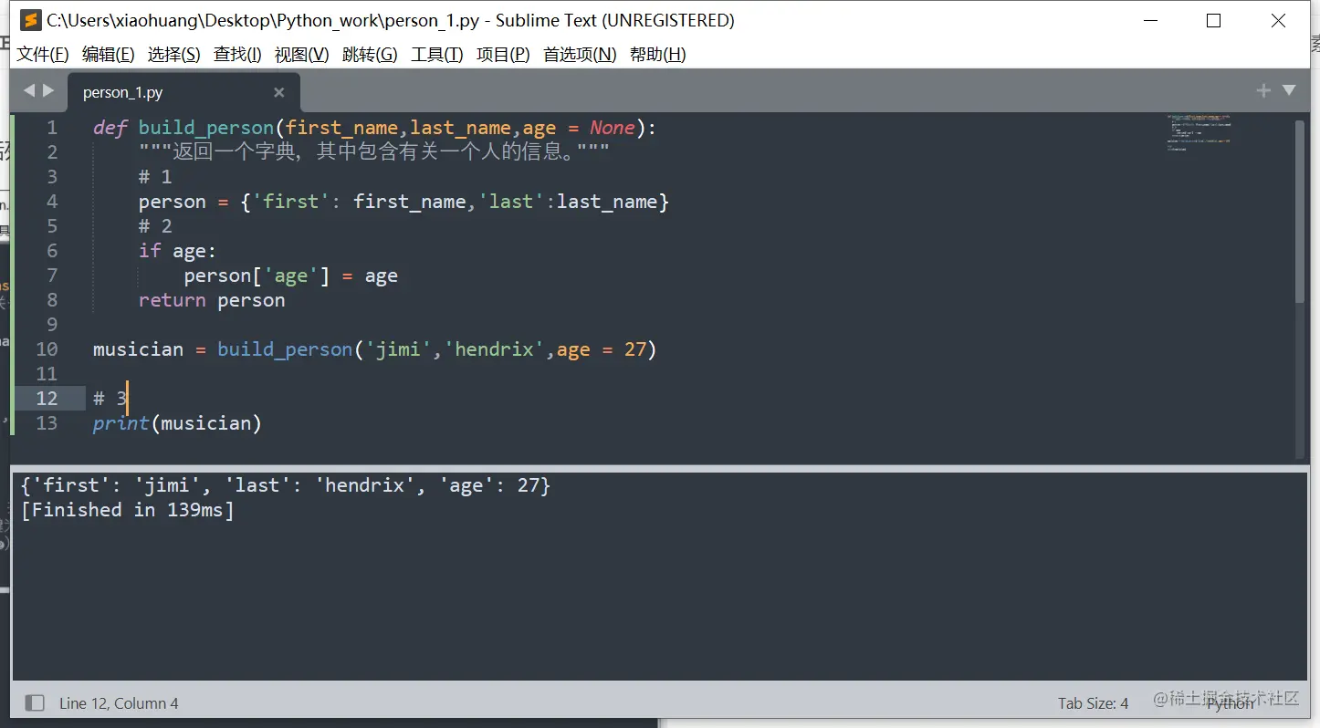 - 在函数定义中,新增了一个可选形参age,并将其默认值设置为特殊值None(表示变量没有值)。可将None视为占位值。在条件测试中,None相当于False。如果函数调用中包含形参age的值,这个值将被存储到字典中。在任何情况下,这个函数都会存储人的姓名,但可进行修改,使其同时存储有关人的其他信息。