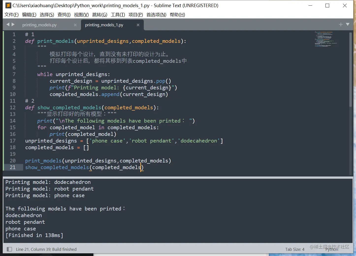 - 这样函数print_models()依然能够完成工作,因为它获得了所有未打印的设计的名称,但使用的是列表unprinted_designs的副本,而不是列表unprinted_designs本身。像以前一样,列表completed_models也将包含打印好的模型的名称,但函数所做的修改不会影响到列表unprinted_designs。