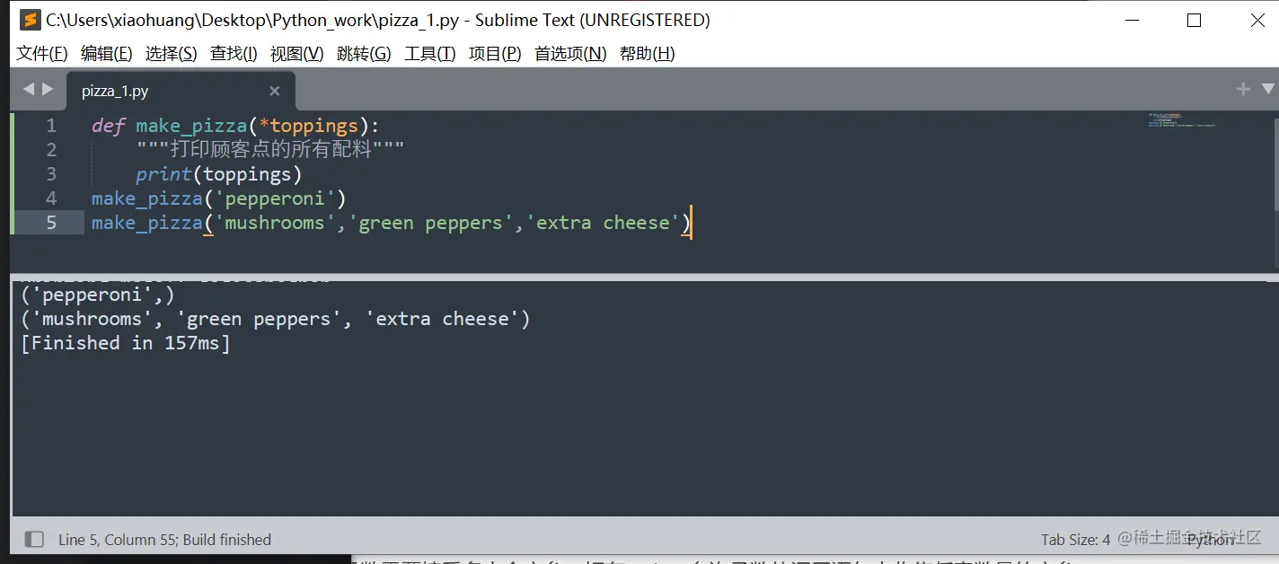 例如,来看一个制作比萨的函数,它需要接受很多配料,但无法预先确定顾客要多少种配料。下面的函数只有一个形参*toppings,但不管调用语句提供了多少实参,这个形参会将它们统统收入囊中: