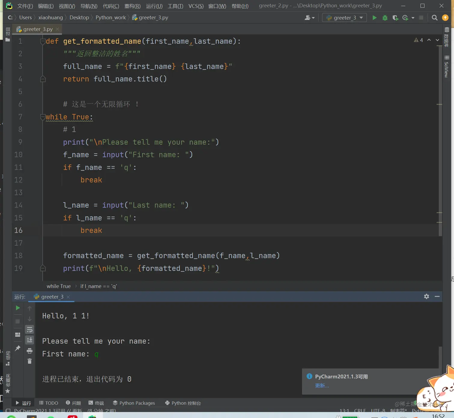 - 如果是,就退出循环。现在,这个程序将不断地问候,直到用户输入的姓或名为'q':