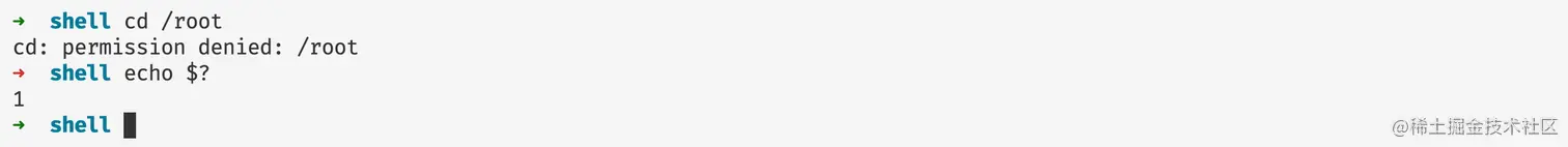 上面直接进入root用户的目录,因为没有权限,查看进程的退出码等于1。