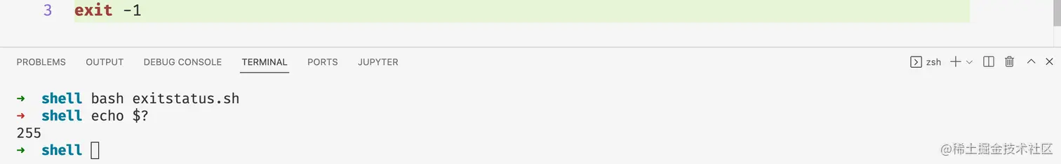 在上面的图当中-1的二进制表示等于1111_1111 因此最后得到的退出码等于1111_1111 = 255。