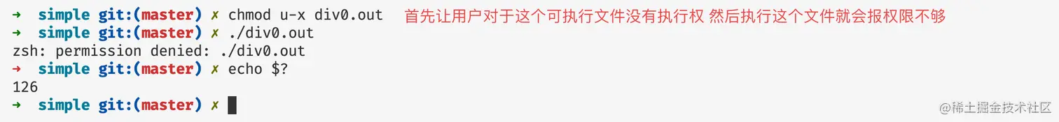 当因为权限问题或者命令不可以执行那么进程的退出码就是126: