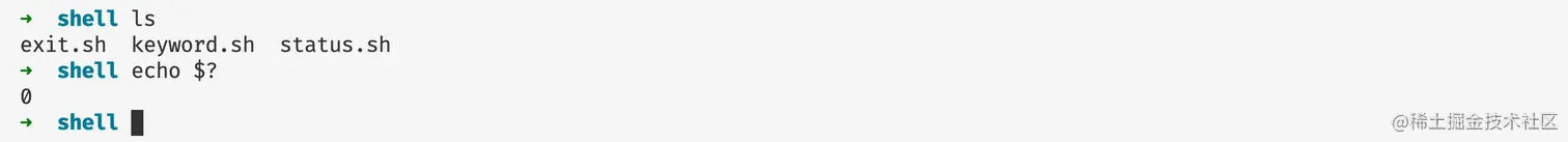 我们在命令行当中可以通过命令 echo $? 查看上一个进程退出时候的退出码,这里的上一个进程就是 ls 命令:
