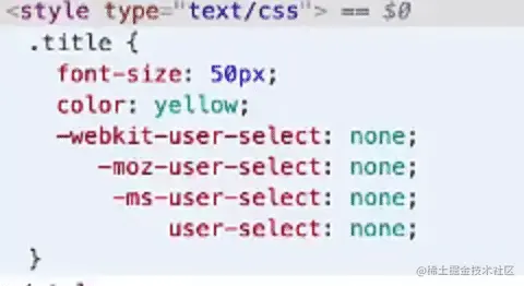 @fontSize: 50px; @fontColor: yellow; .title { font-size: @fontSize; color: @fontColor; user-select: none; //(查看第6点跟这个有关) } -