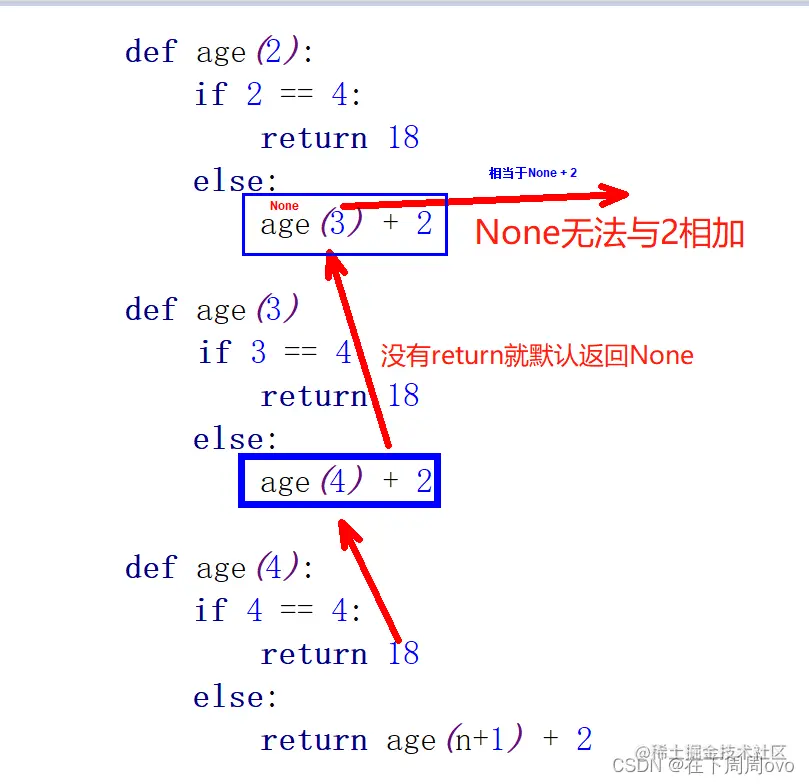 def age(n): if n == 4: return 18 else: age(n+1) + 2 print(age(2)) 输出结果: TypeError: unsupported operand type(s) for +: 'NoneType' and 'int' 错误翻译: TypeError:+ 不支持的操作数类型:“NoneType”和“int”