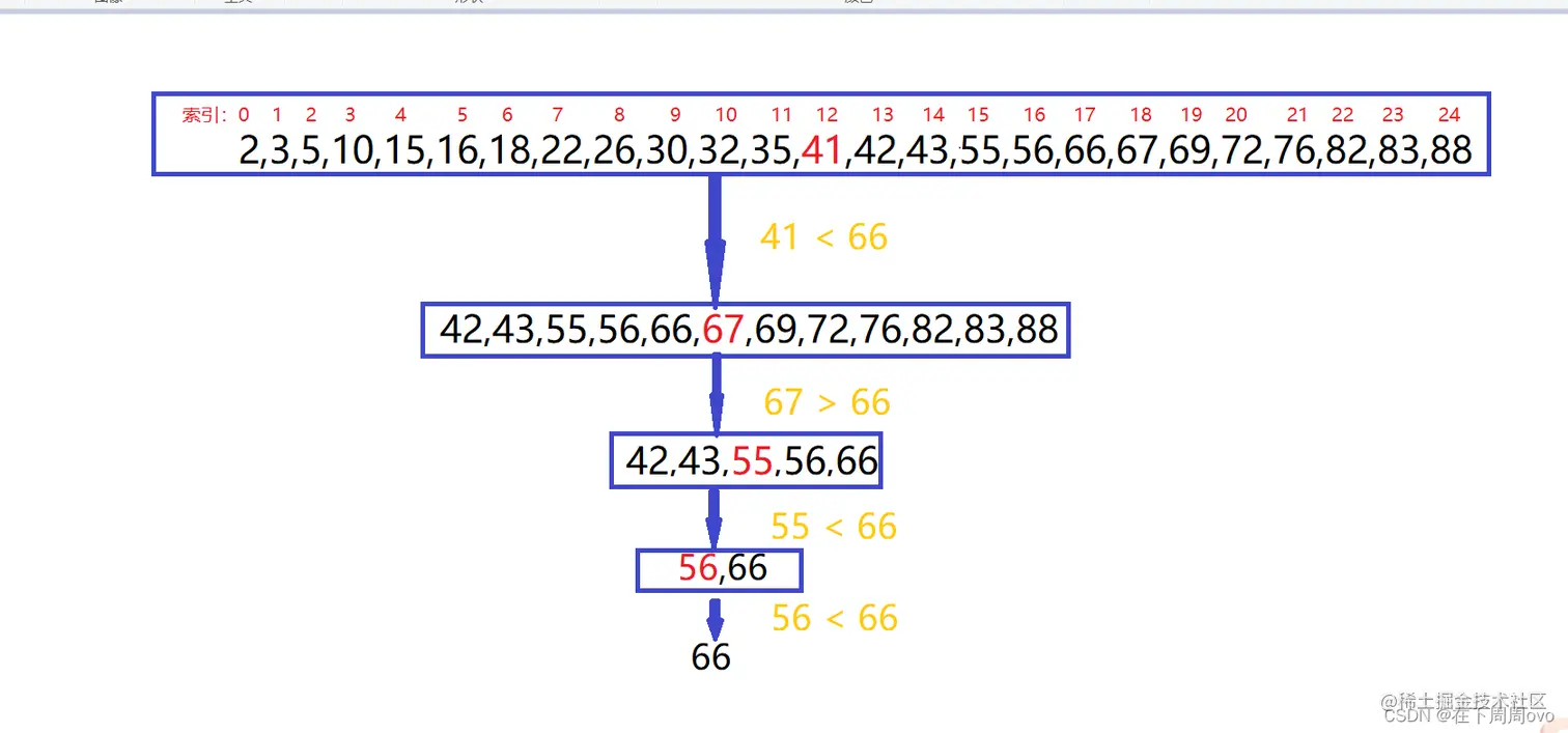 比如们要在列表中找到元素66对应的位置,应该将每一次列表的中间数与66进行比较,第一次比较中间值41<66,则说明66位于41的右边,则下一次取41右边的所有数的中间值与66进行比较,以此类推直到中间值与66相同就找到了66所在的位置。