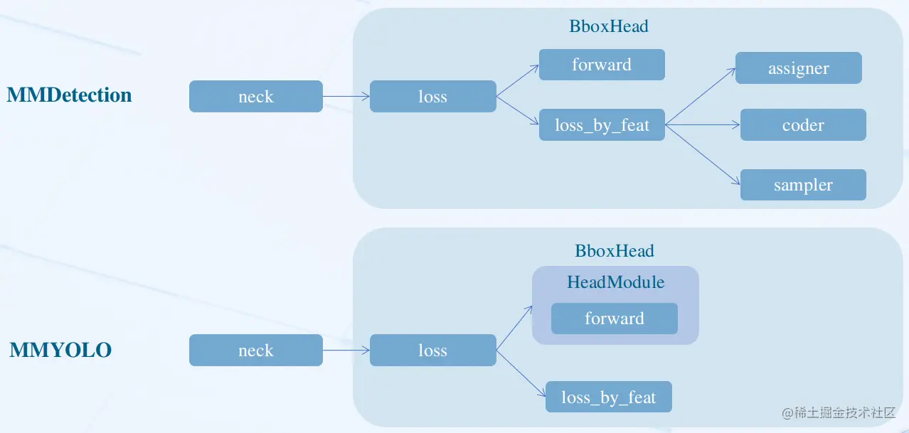 上图为 MMYOLO 相比 MMDetection 3.0 在 loss 计算中的组件差异。可以发现 MMYOLO 对 loss 计算过程进行了简化,不再刻意强求划分三大组件,其好处是不再需要对内部数据进行层层数据封装,简化了代码逻辑,加快了训练速度、减轻了社区使用、理解和魔改难度。