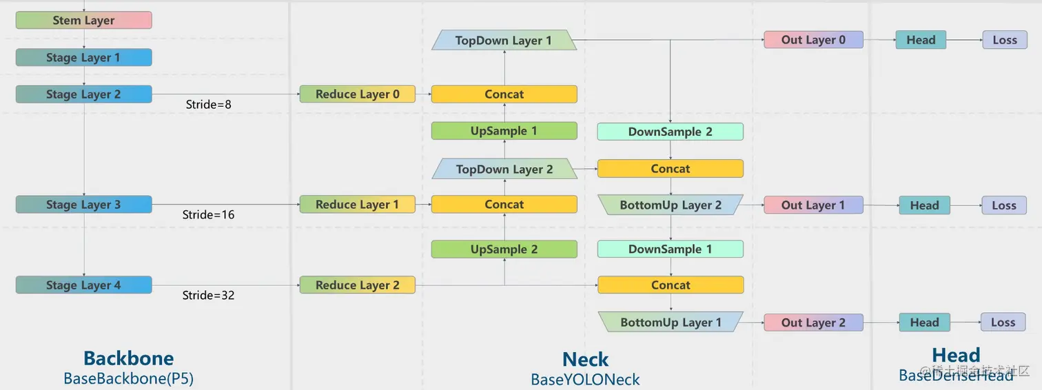 为了方便用户理解网络结构,同时为了能够在基类中提供一些通用功能,MMYOLO 抽象了 BaseBackbone 和 BaseYOLONeck 基类。
