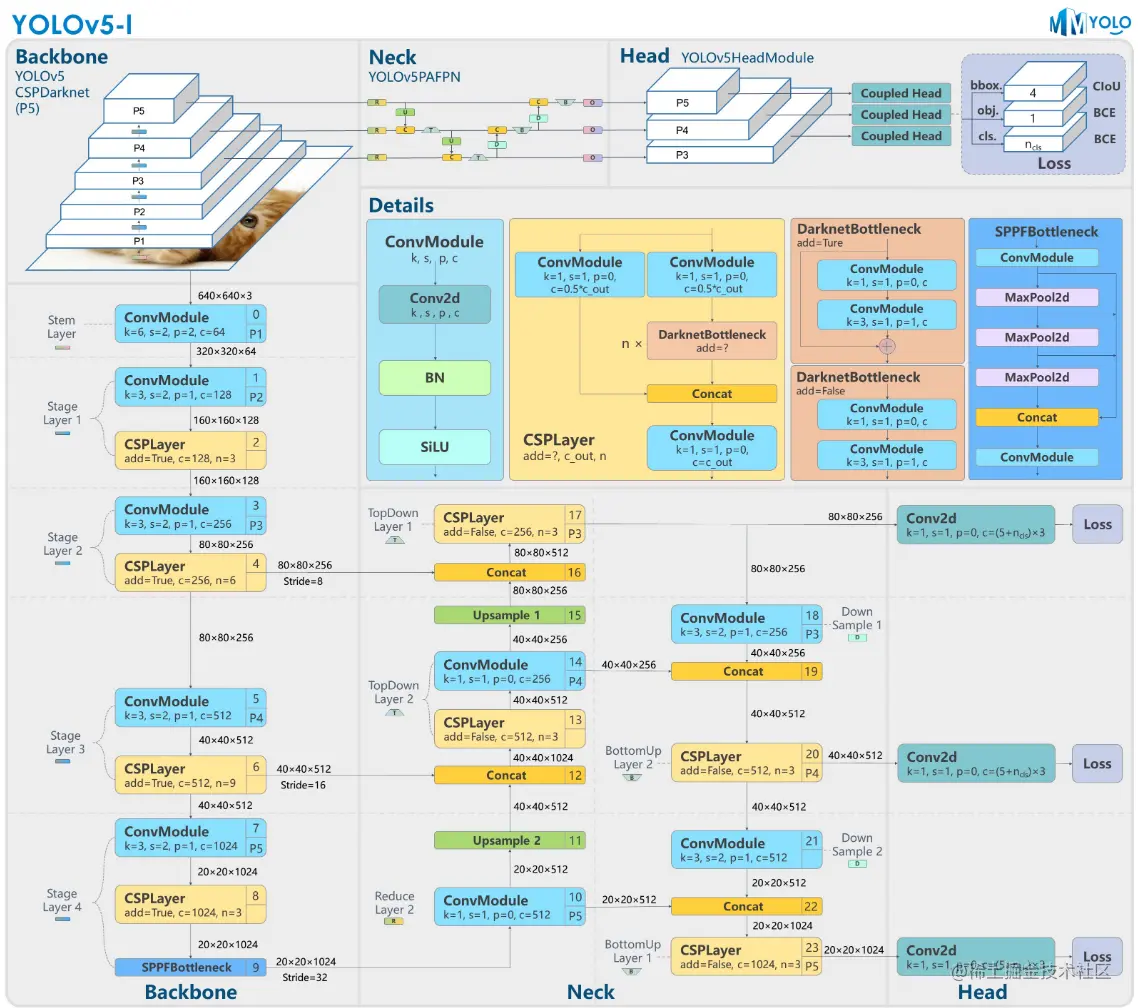 需要特别强调的是由于 MMYOLO 中抽象了 BaseBackbone 和 BaseYOLONeck,因此我们可以方便快速且采用统一风格对已经复现的算法网络结构进行绘制,进一步方便用户理解。典型图如下所示: