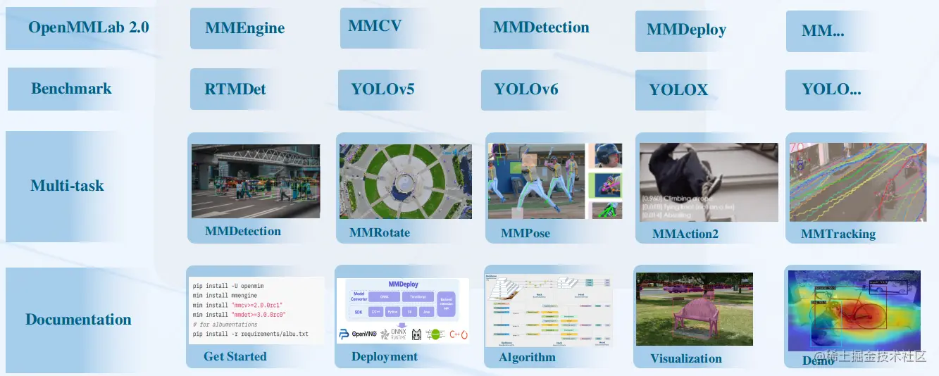 MMYOLO 致力于在复现诸多 YOLO 算法的基础上,提供公平统一的算法评测流程,支持多任务易扩展的高效训练推理引擎,提供丰富的从入门到进阶的教程文档,我们希望将其打造成 YOLO 系列核心热门开源库以及工业应用核心库。