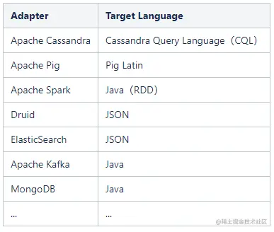 上面介绍的Calcite集成方法,都是把Calcite的模块当做库来使用。如果觉得太重量级,可以选择更简单的适配器功能。通过类似Spark这些框架里自定义的Source或Sink的方式,来实现和外部系统的数据交互操作。