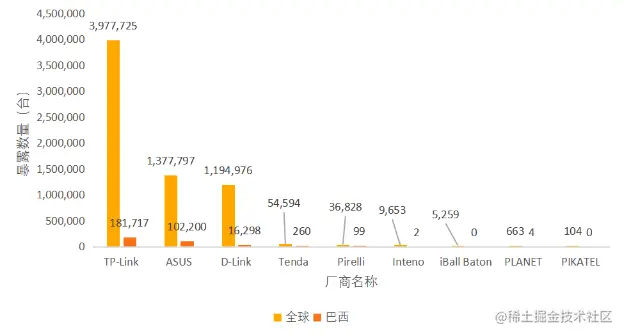 图 4.17 是潜在受影响的设备厂商的分布情况,之所以从这个角度来考虑,是因为 Exploit-DB的数 据仅为互联网上披露出来的数据,但一个厂商设备型号众多,未必会被全面进行测试,未被披露的型号 同样可能存在相同的漏洞。从图 4.17 可以看出,TP-LINK、ASUS和 D-Link路由器的全球暴露数量均超 过百万,而在巴西,这三个厂商的设备也有一定的暴露面。但是这些设备有多少的 DNS 可被篡改,我 们尚未验证。