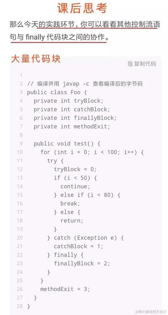 举个例子,在 「第6篇 | JVM是如何处理异常的?」 中,作者讲解了Java虚拟机异常处理的机制,并留下了思考题: