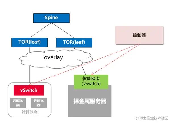 业界头部云厂商采用的是智能网卡方案,也就是在裸金属服务器上插入特殊的智能网卡,使用智能网卡中的vSwitch进行封装,这样只会消耗智能网卡的CPU和内存,不会消耗裸金属自身的资源。具体运作如下图所示:
