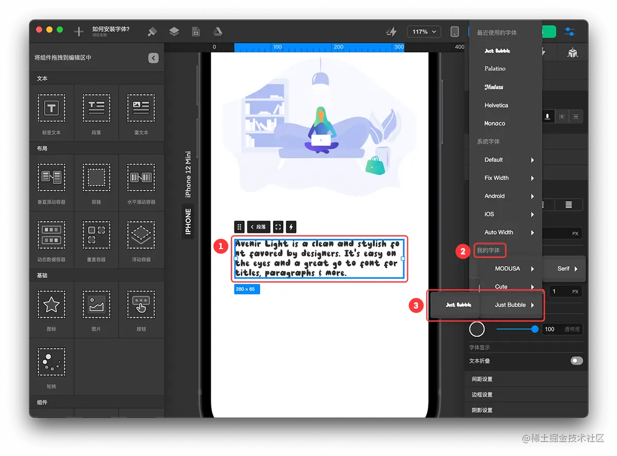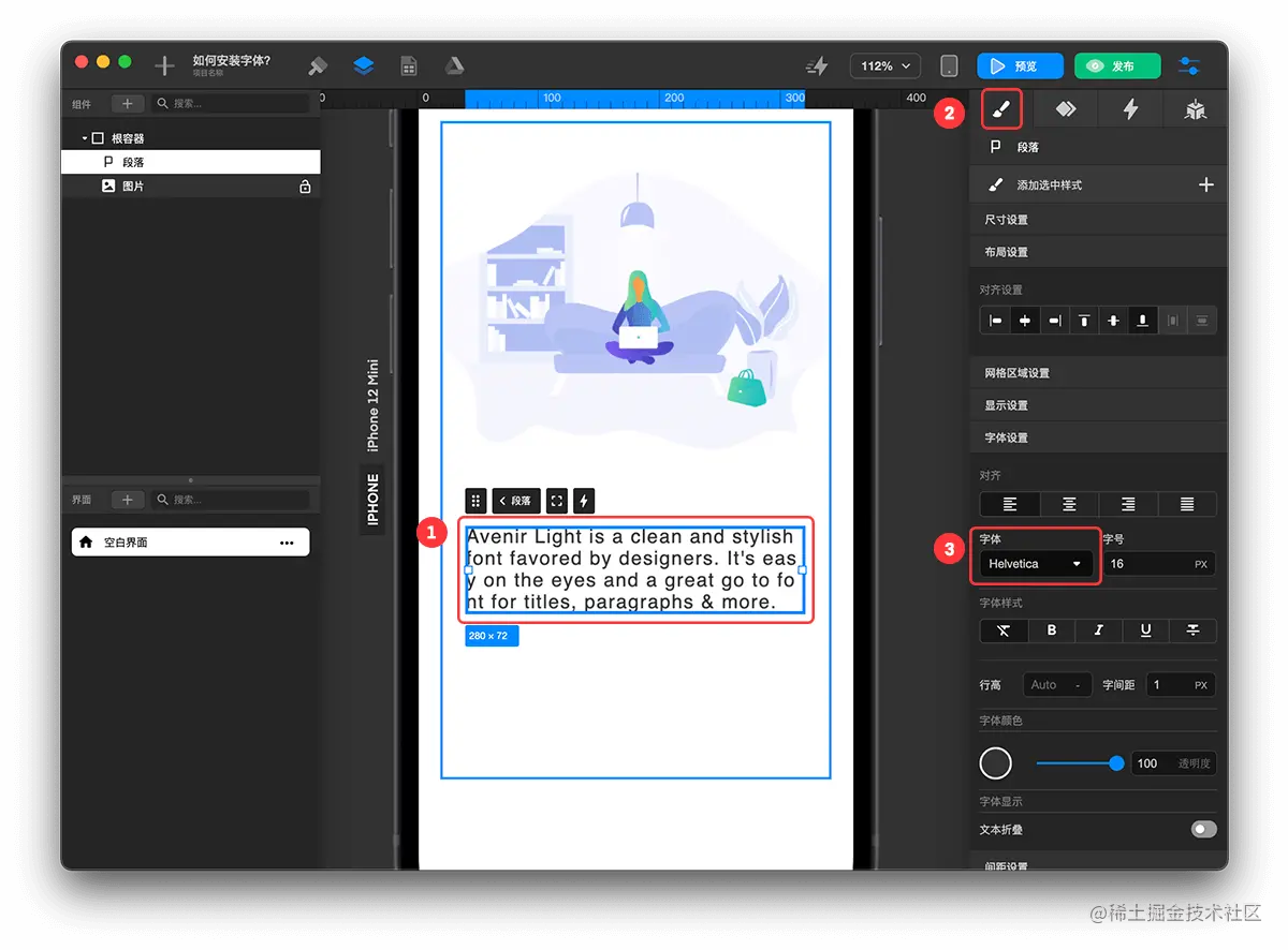 如何在素材中心中下载字体并安装? TOWIFY 2022-10-24 172 阅读1分钟 前置准备: 文本组件 具体步骤: 进入 字体素材中心 下载安装字体 应用字体 步骤分解: 进入字体素材中心 选中文本组件 点击检查器面板的样式 选择字体设置 点击字体素材中心 下载安装字体 进入字体素材页面 点击 Install 安装 应用字体 选中文本组件 进入我的字体 应用字体