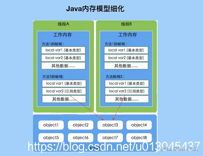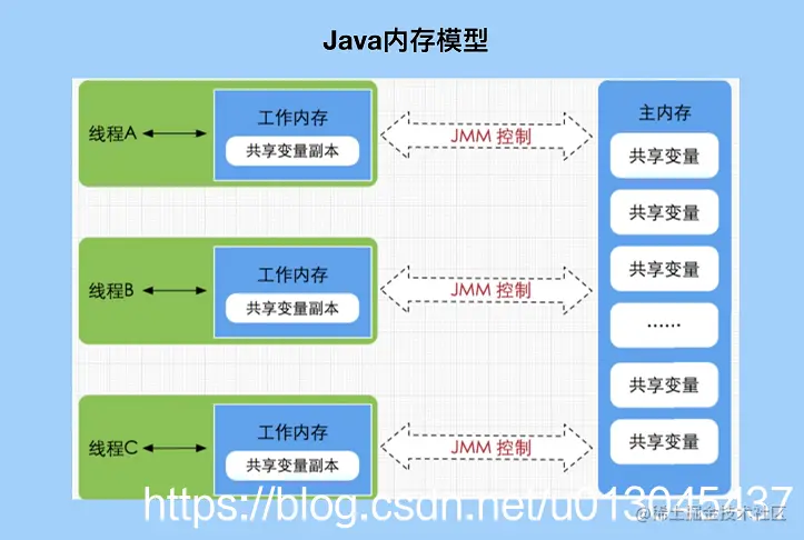 java内存模型即java memory model,简称JMM。 用来屏蔽掉各种硬件和操作系统的内存访问差异,以实现java程序在各平台下都能达到一致性的内存访问效果。