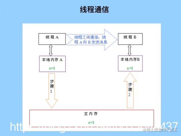 如上图,本地内存A和B有主内存中共享变量x的副本,初始值都为0。线程A执行之后把x更新为1,存放在本地内存A中。当线程A和线程B需要通信时,线程A首先会把本地内存中x=1值刷新到主内存中,主内存中的x值变为1。随后,线程B到主内存中去读取更新后的x值,线程B的本地内存的x值也变为了1。