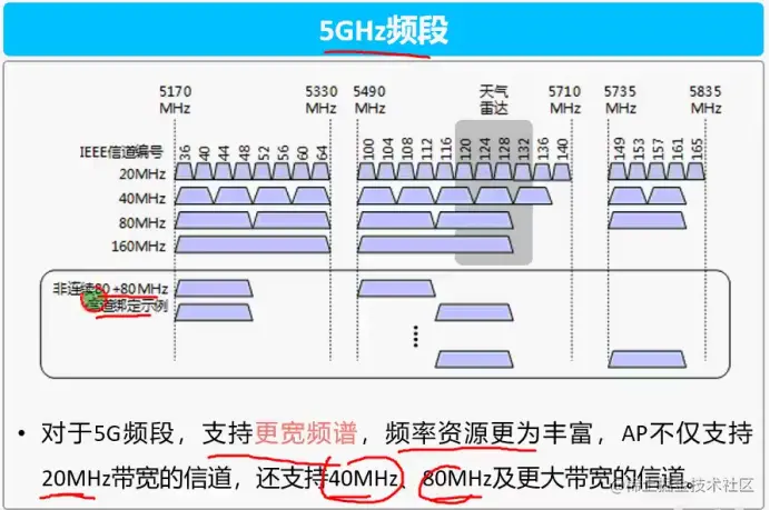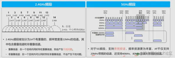 支持更宽频谱,因为波长短,频率资源更丰富,AP不仅支持20MHz带宽的信道,还支持40MHz、80MHz及更大宽带的信道。