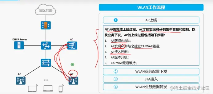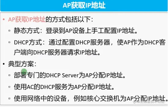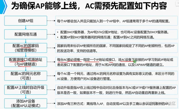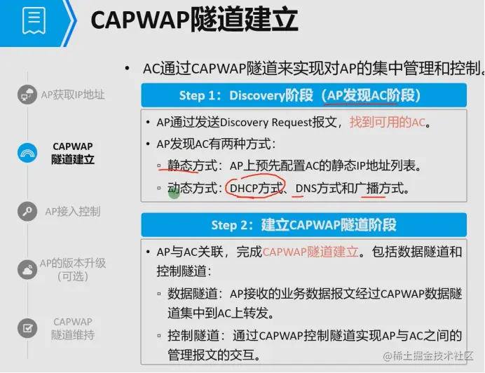 AP获取IP地址(一般由DHCP服务器动态分配地址)并发现AC(AP通过DHCP服务器的option得到AC的IP),与AC建立连接(建立连接后,AP上线,capwap隧道建立)编辑