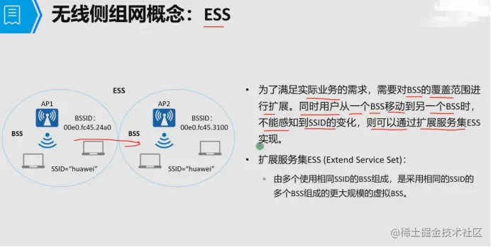 相同名字的SSID组成的无线局域网叫做ESS,可实现用户从一个BSS移动到另一个BSS时,不感知到SSID变化,使用扩展服务集ESS实现。