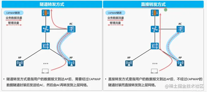 ****直接转发方式:****AP数据不经过AC,直接以以太网二帧的格式转发到上层网络。