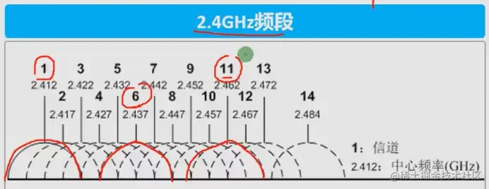 每个频段划分为多个信道,例:2.4GHz频段被分为14个信道