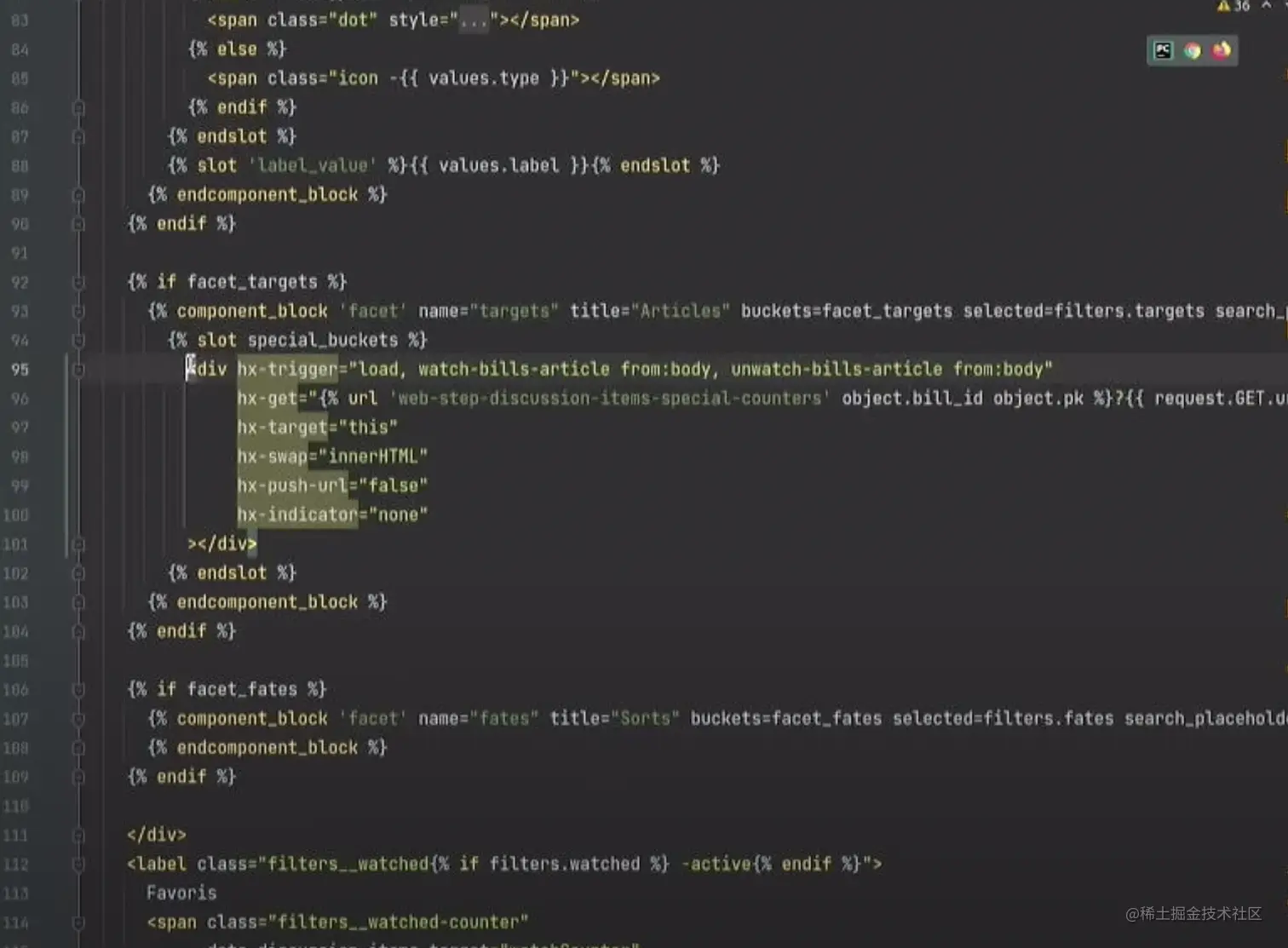 除此之外,还有一部分交互逻辑是在后端HTML模版中产生的。下图是Django中结合htmx的后端模版代码示例: