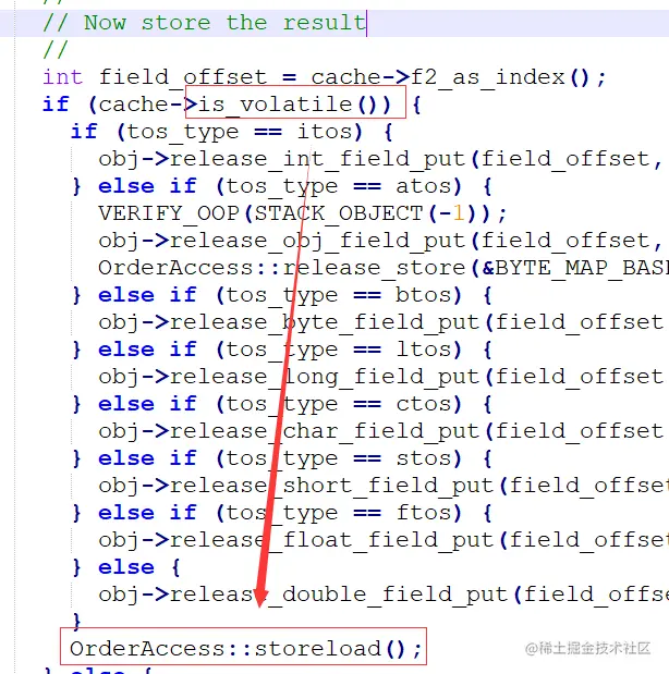 从源码中我们可以发现,该关键字调用了storeload()方法,从这个方法命我们就可以知道,这里开始调用内存屏障的实现了。