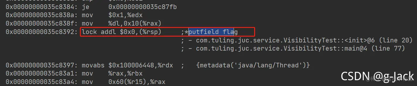 //volatile 是通过内存屏障来实现 可见性 ,汇编层面 会在执行的指令前面 增加 lock关键字