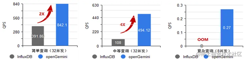 openGemini相比开源InfluxDB,简单查询场景提升2倍多,中等查询场景提升4倍多;复杂查询场景下,openGemini依然可以快速响应,然而InfluxDB则出现OOM无法工作。