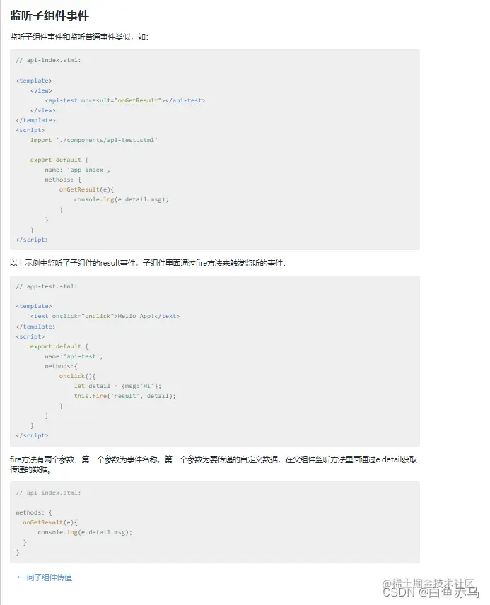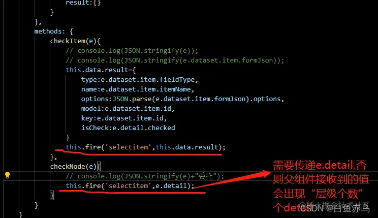 fire方法有两个参数,第一个参数为事件名称,第二个参数为要传递的自定义数据,在父组件监听方法里面通过e.detail获取传递的数据。 在递归调用子组件的监听方法中给父组件传递参数的时候需要去e.detail,不能直接传e,否则会出现多个detail的层级。