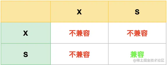 - 当一个事务对一条记录加了 S 型记录锁后,其他事务也可以继续对该记录加 S 型记录锁(S 型与 S 锁兼容),但是不可以对该记录加 X 型记录锁(S 型与 X 锁不兼容);