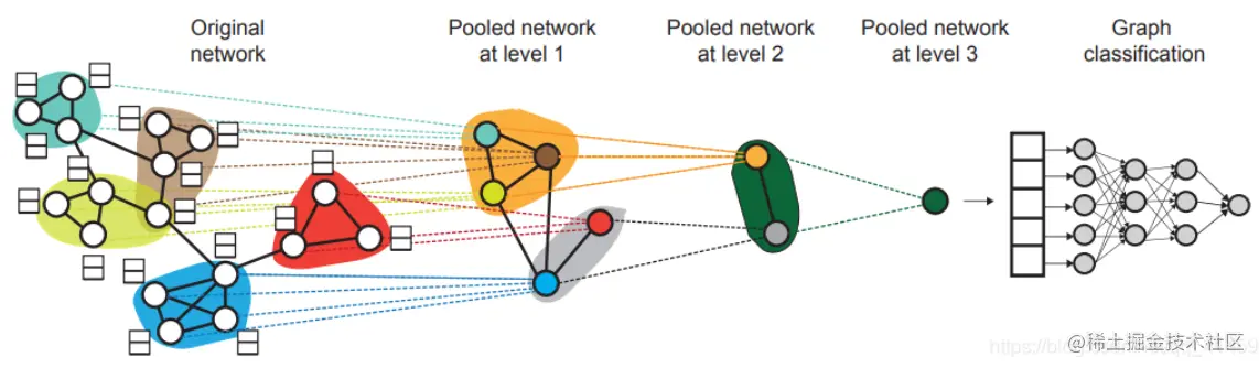 DIFFPOLL是首个将图坍缩过程与GNN结合起来进行图层面任务学习的算法。