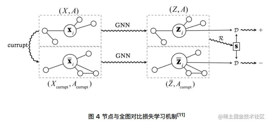 首先为了得到负采样的样本,需要对图数据进行相关扰动,得到(Xcurrupt,Aaurrupt)。然后将这两组图数据送到同一个 GNN 模型中进行学习。为了得到图的全局表示,使用读出机制对局部节点的信息进行聚合。过程示意图如下: